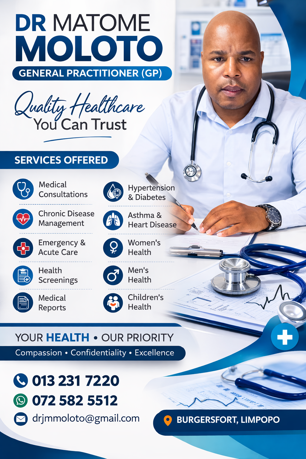 Your health deserves the best care — and we are here to provide it. Whether you need a check-up, chronic disease management, screenings, or simply trusted medical advice, Dr. Matome Moloto and his team are ready to assist you.